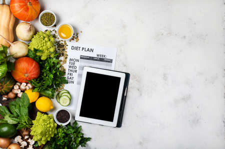 Weight loss program Diet plan and set fresh products. Top view Copy space.