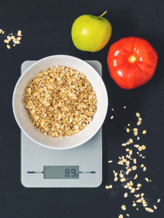 Diet concept, proper nutrition, healthy eating. Oatmeal in a white plate on the kitchen scale. Weighing products. Breakfast, Top View