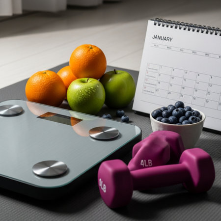 Fitness still life with dumbbells, scale, fruits and calendar