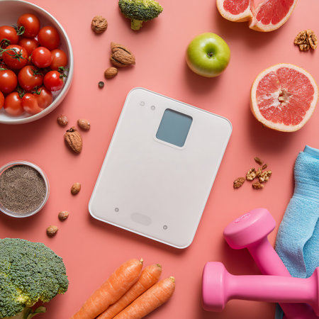 Flat lay of weight scale with fruits and vegetables on pink background