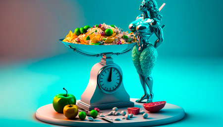 An image of a woman standing next to scale with fruits and vegetables. Generative AI.