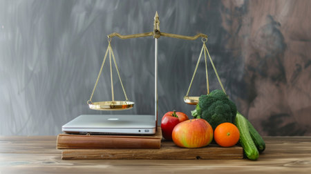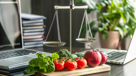 Balance between technology, the world of work and healthy nutrition. A classic scale represents the balance between a laptop and fresh vegetables, symbolically arranged on a wooden table.
