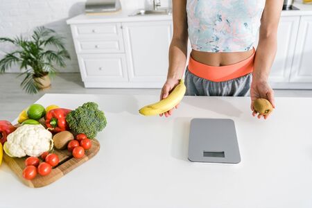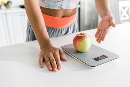 cropped view of woman gesturing near food scales and apple