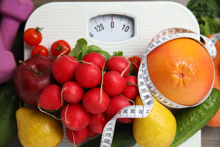 Diet and Healthy life loss weight exercise Concept. Fresh fruits salad vegetable with Weight scale measure prevention for women diet slimming. Lifestyle Time and Healthy