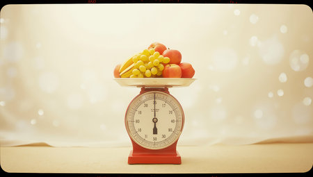 Fruits on a weight scale with bokeh background, vintage style