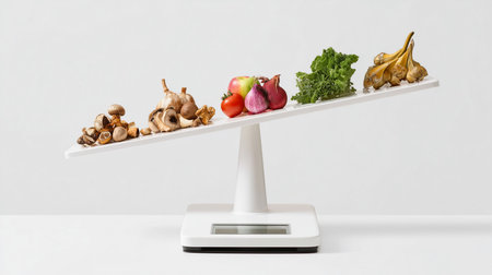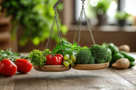 A wooden scale balances fresh vegetables, including broccoli and tomatoes, in a cheerful kitchen atmosphere.