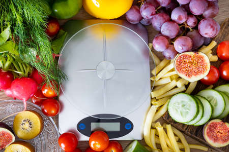 Empty kitchen scale. There are plenty of vegetables and fruits around. Concept of a healthy diet and counting calories