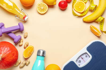 floor scales, tape measure and healthy products on a colored background top view