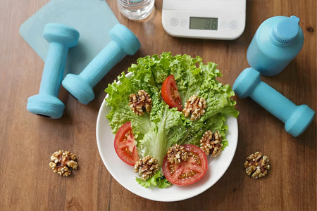Kitchen scales and dumbbells. Sound body keeps sound mind.