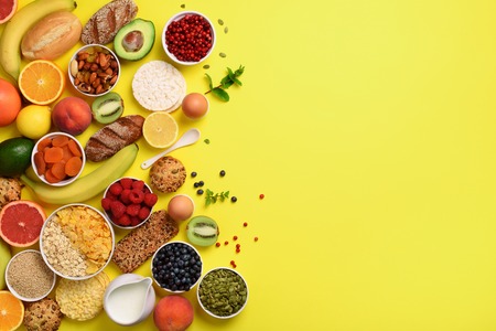 Organic food frame. Healthy breakfast ingredients. Oat and corn flakes, eggs, nuts, fruits, berries, toast, milk, yogurt, orange, banana, peach on yellow background. Top view, copy space. Flat lay.