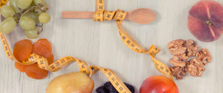Centimeter with spoon and fresh healthy nutritious food as source vitamins, dietary fiber and natural minerals, slimming concept