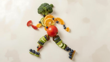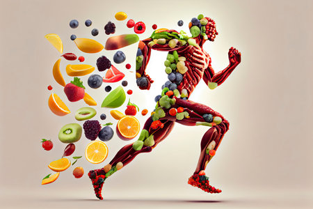 Artistic representation of a running figure crafted from colorful fruits and vegetables, symbolizing health and vitality, ideal for wellness and fitness themes.