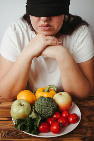 Healthy vegetarian food. Fat woman with vegetables