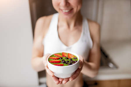 diet concept with sporty woman kitchen. High quality photo