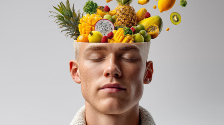 An artistic composition featuring a man's profile surrounded by fresh fruits, vegetables, and herbs, blending surreal elements with healthy living themes.