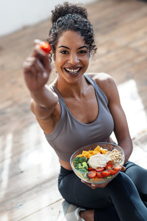 Close up of athlete eating healthy food after her sports training.