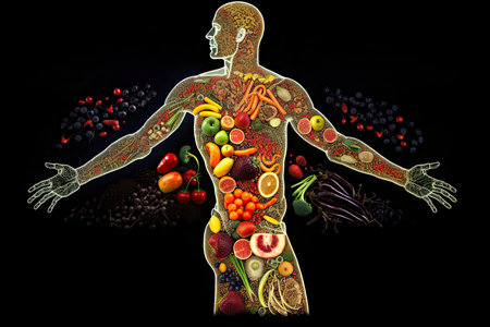 outline of a human with bolts of energy running through the body, the body is surrounded by fruit.Generative AI