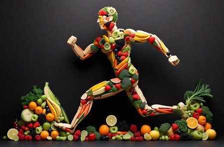 A creative figure of a runner made from fresh fruits and vegetables, symbolizing healthy living