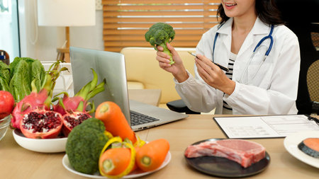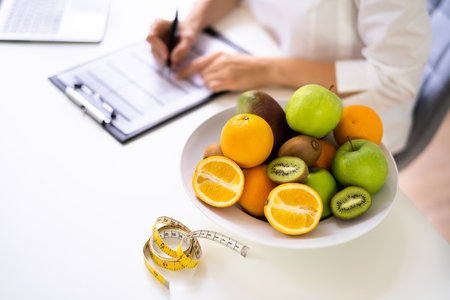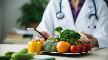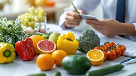 Close-up of a nutritionist discussing a personalized diet plan with a patient, with a variety of colorful fruits and vegetables laid out on the desk