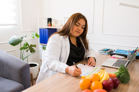 Latin plus size woman nutritionist writing in her office and ready for a patient to talk about healthy eating and diet