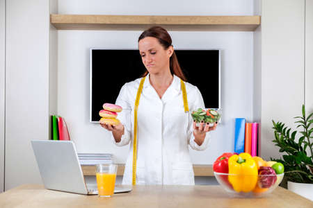 Young woman wearing nutritionist uniform holding a salad and donuts with sad emotions in bright modern office room. Choosing between healthy food and unhealthy dessert