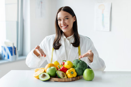 Cheerful dietitian in lab coat pointing at fresh fruits and vegetables on table. Weight loss consultant recommending healthy plant based diet