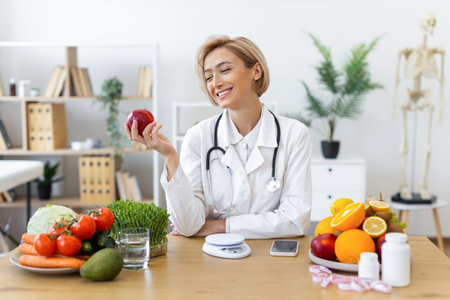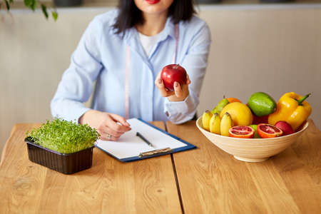 Nutritionist, dietitian woman at the office, hold apple in the hand, healthy vegetables and fruits, healthcare and diet concept. Female nutritionist with fruits working at her desk.