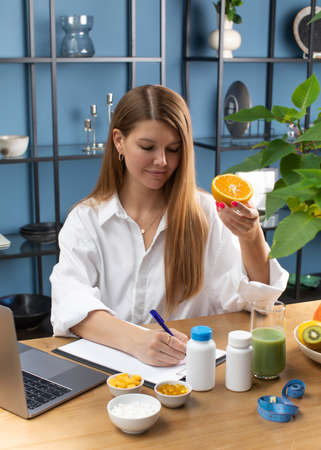 Portrait of young female nutritionist working. Diet and healthy food. Woman dietitian in medical uniform with tape measure working on a diet plan. Weight loss and right nutrition concept