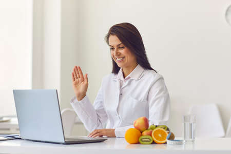 Nutritionist uses a laptop to conduct an online consultation with his patient while sitting in his office. Female doctor in a medical gown greets people on video call waving hand.