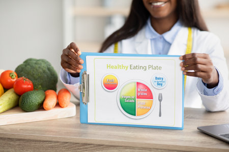 Young african american female nutritionist showing schematic healthy eating plate for diet, sitting at workplace