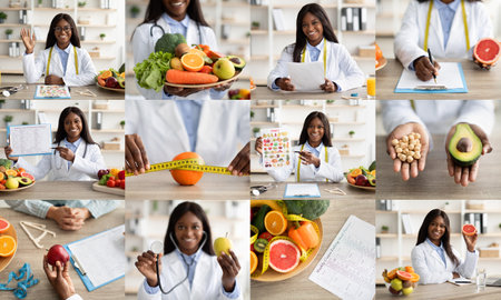 Cheerful african american nutritionist giving online consultations at workplace in clinic office, screenshot view