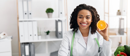 Smiling black woman nutritionist recommending grapefruit and barbell for weight loss, clinic interior
