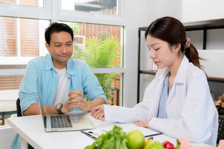 Young Asian man come to meet the nutritionist in hospital and talking about dieting and eating. Expertise nutritionist giving a eating recommendation to a man who have health problem.
