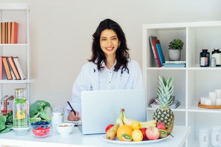 Positive Indian female nutritionist having online consultation with client at office desk with fresh vegetables, prescribing nutritional supplements and vitamins, making balanced corrective diet plan.