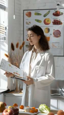 Female dietitian holding a clipboard with a food chart in a brightly lit kitchen with fruits and vegetables. Promoting healthy lifestyle and nutrition education.