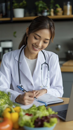 Asian female healthcare worker is happily taking notes on diet plan for patients to help them maintain healthy lifestyle