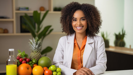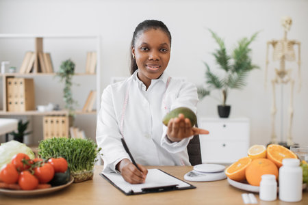 Dietary Guidance - Afro Nutritionist with Fresh Fruits and Vegetables, Encouraging Healthy Food Choices in Clinic