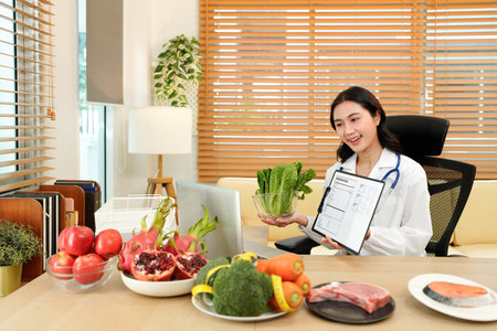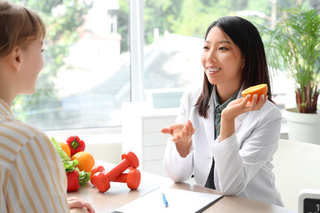 Asian nutritionist consulting patient in clinic, meal plan discussion, healthcare advice, weight loss support, doctor talking and explaining patient for nutrition consultation, wellness care.