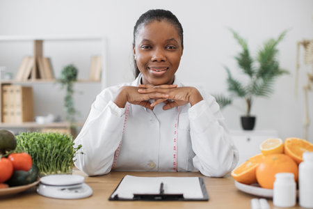 Smiling multiethnic woman in doctors coat carrying out professional activity as nutrition specialist in clinic. Confident health professional thinking over meal plans of clients at office desk.
