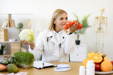 Mature female doctor nutritionist holds fresh organic tomatoes and cabbage.
