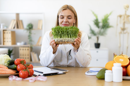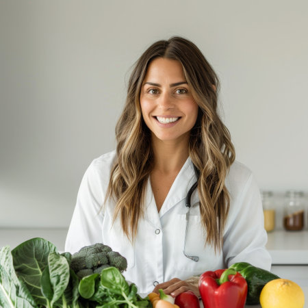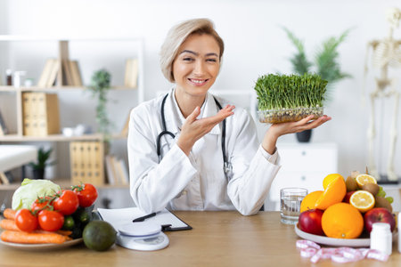 A smiling nutritionist in a white coat presents fresh sprouts and various fruits and vegetables, promoting healthy eating.