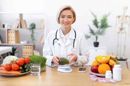 Portrait of smiling multicultural lady wearing white coat with avocado in hand posing at writing desk. Cheerful expert in food and nutrition selecting food for special diet in doctors workplace.