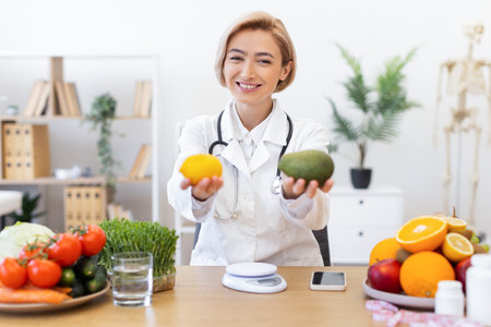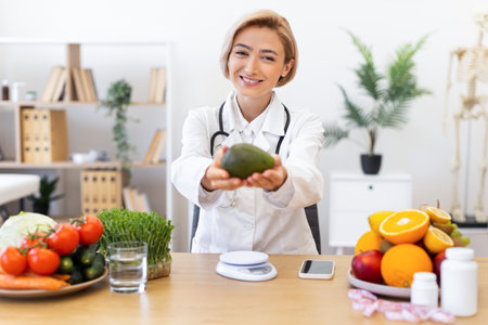 A smiling nutritionist in a white coat holds out an avocado, promoting healthy eating and wellness.