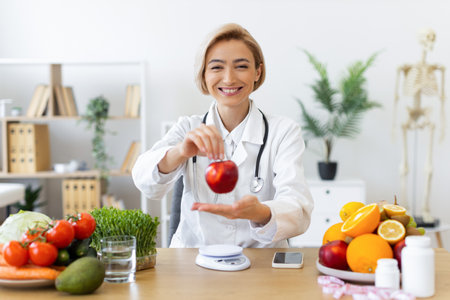 A smiling dietitian in a white coat holds out a red apple, promoting healthy eating habits and nutrition.