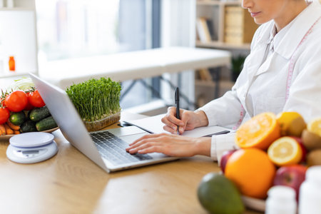 A dietitian is working on a laptop surrounded by fresh fruits and vegetables, creating a healthy meal plan.