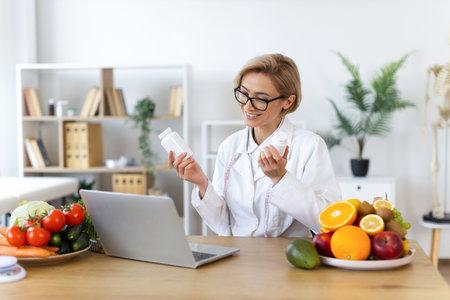 A nutritionist consults with a patient online, holding up supplement bottles and surrounded by fresh produce.