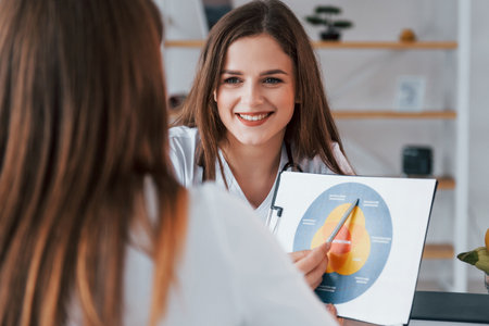 Adult caucasian nutritionist doctor in white coat shows weight loss plan to young lady patient