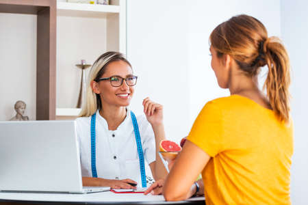 Doctor nutritionist, dietician and female patient on consultation in the office. young smiling female nutritionist in the consultation room. Nutritionist desk with healthy fruit and measuring tape.