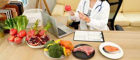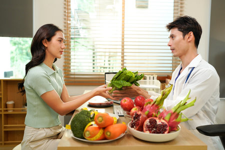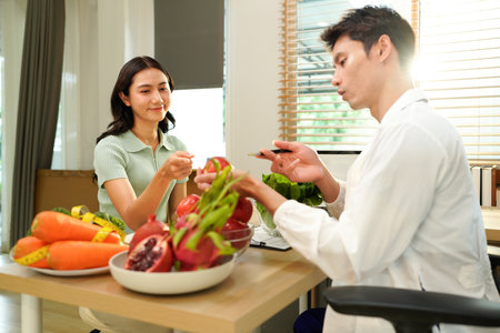 Nutritionist giving consultation to patient with healthy fruit and vegetable, Right nutrition and diet concept.
