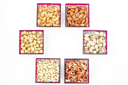Variety of nuts on white background. Macadamia,cashew,peanuts and almond nuts.